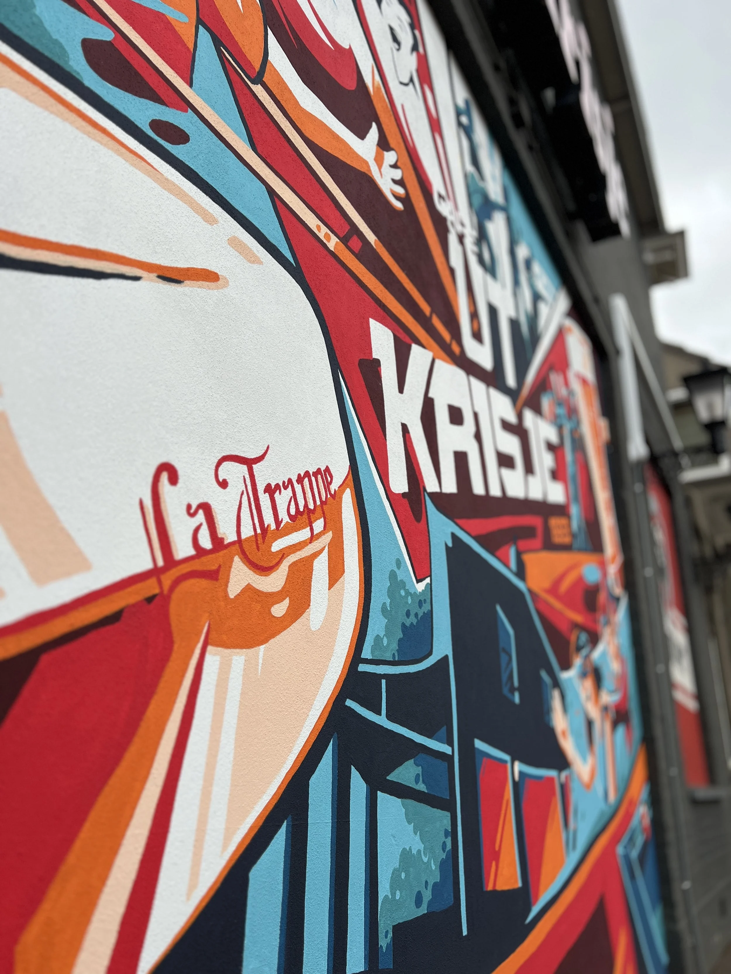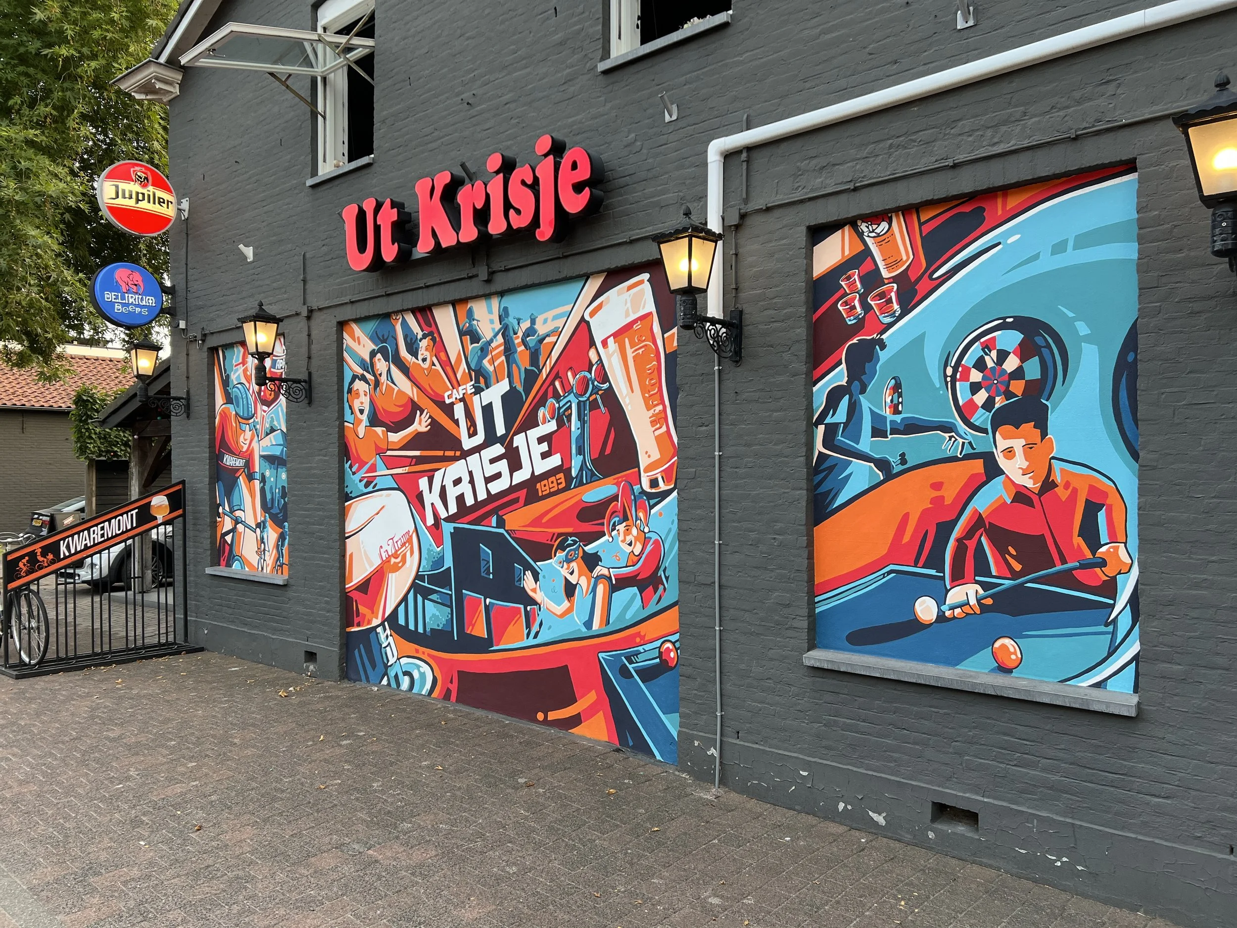 Een jaar na de muurschildering bij Het Kaffee heb ik ook bij de buren, Café Ut Krisje in Rijsbergen, een nieuwe muurschildering mogen realiseren. Het ontwerp is volledig door mijzelf gemaakt en eigenhandig op de muur geschilderd. De enthousiaste reacties en de positieve sfeer die het werk teweegbrengt, geven me enorm veel voldoening. Trots dat ik opnieuw een creatieve bijdrage heb mogen leveren aan het straatbeeld van Rijsbergen.